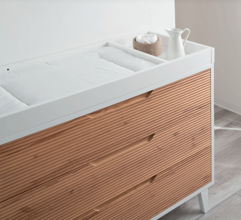 Realizzato in pregiato legno di faggio, disponibile in raffinato bianco laccato o caldo tono biscotto, offre robustezza e sicurezza, unendo tradizione artigianale e design moderno. Un complemento d'arredo che dona ordine e amore al nido dei più piccoli.